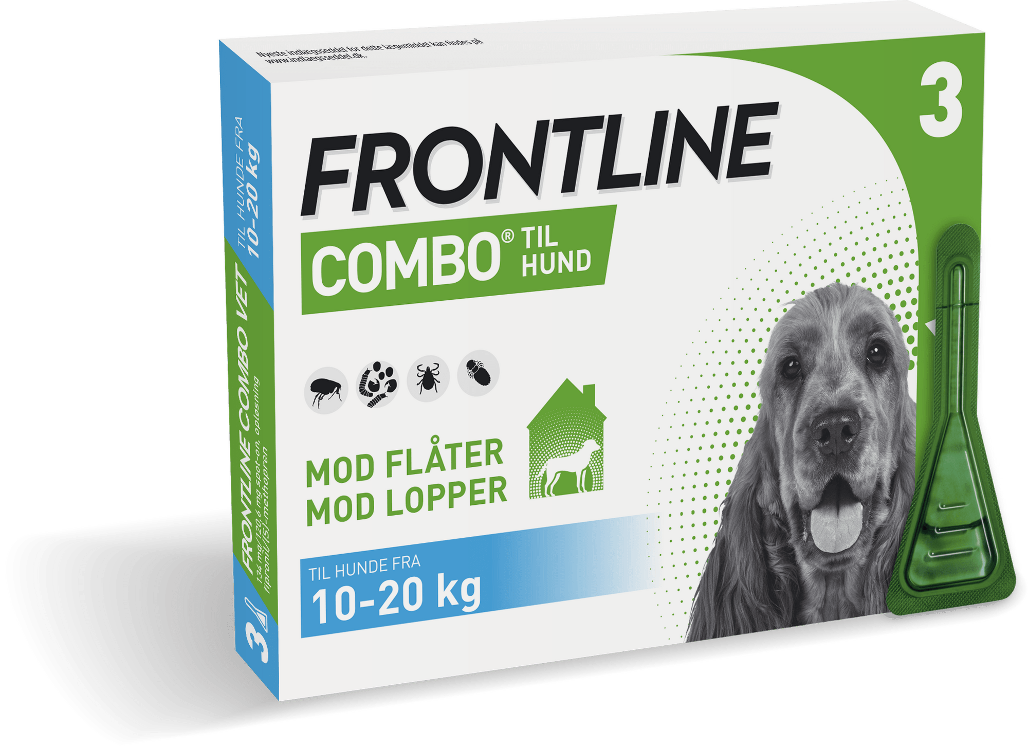 Frontline Combo Vet. er et middel til brug på huden mod lopper og flåter. Opløsningen indeholder en kombination af et aktivt stof med adulticide egenskaber, fipronil, og et aktivt stof med ovicide og larvicide egenskaber (S)-methopren. Indikationer: Behandling mod angreb af lopper, flåter og bidende lus hos hund og kat samt angreb af lopper og flåter hos ilder. Beskytter mod nye angreb af voksne lopper i op til 8 uger hos hund og 4 uger hos kat og ilder. Forebygger loppernes formering ved at hæmme udviklingen af æg (ovicid effekt) samt larver og pupper (larvicid effekt) fra æg lagt af voksne lopper i op til 8 uger hos hund og 6 uger hos kat. Effekten over for flåter varer i op til 4 uger hos hund og ilder og 2 uger hos kat. Kan indgå i behandling af allergisk eksem forårsaget af loppeangreb. Mindste behandlingsinterval er 4 uger. Kan anvendes til drægtige og diegivende dyr. Kontraindikationer: Må ikke anvendes til hunde under 8 uger og/eller 2 kilo, katte under 8 uger og/eller 1 kilo samt ildere yngre end 6 måneder. Bør ikke anvendes til syge eller afkræftede dyr. Må ikke anvendes til kaniner. Præparatet til hund bør ikke anvendes til kat/ilder, da dette kan medføre overdosering. Da der ikke foreligger data herom, anbefales det ikke at anvende præparatet til andre dyr end målarterne. Administrationsmåde: Til udvortes brug. Dosering: Til hund: 1 pipette à 0,67 ml fra 2-10 kg; 1 pipette à 1,34 ml fra 10-20 kg; 1 pipette à 2,68 ml fra 20-40 kg; 1 pipette à 4,02 ml til hunde over 40 kg legemsvægt. Til kat og ilder: 1 pipette à 0,5 ml. OBS. Der er forskel i styrkerne på produktet til hund og til kat/ilder. Man bør ikke overdosere. Bivirkninger: Blandt de meget sjældne bivirkninger, der er iagttaget efter brug, er: Forbigående hudreaktioner på applikationsstedet (hudmisfarvning, lokalt hårtab, kløe, rødmen) samt generel kløe og hårtab. Ligeledes er udtalt savlen, reversible nervøse symptomer (forstærket berøringssans, depression, andre nervøse symptomer) samt opkastning og symptomer fra luftvejene observeret. Hvis dyret kommer til at slikke på applikationsstedet, kan voldsom savlen forekomme. Der kan ses forbigående ændringer af pelsens udseende på applikationsstedet (sammenfiltret/fedtet pels). Forsigtighedsregler: Badning med vand inden for 2 dage samt hyppigere end en gang om ugen efter behandling bør undgås. Ved gentagne shampoobade nedsættes virkningsvarigheden. Der foreligger ingen data vedr. mulighed for toksicitet af præparatet hos killinger yngre end 8 uger, der er i kontakt med behandlede moderdyr. Undgå at dyr slikker på behandlingsstedet, og at dyr slikker hinanden efter behandling. Man bør omgå behandlede dyr med forsigtighed, indtil behandlingsstedet er tørt. Tilhæftning af enkelte flåter kan forekomme. Undgå at få produktet i kontakt med mund og øjne. Vask hænderne efter brug. Præparatet kan forårsage irritation af slimhinder, hud og øjne. Dyr eller mennesker med kendt overfølsomhed over for insekticider eller alkohol bør undgå kontakt med produktet. Se endvidere brugsanvisning på pakningen. Pakninger: Æske med 3 pipetter: 0,5 ml, 0,67 ml, 1,34 ml, 2,68 ml og 4,02 ml. Æske 6 pipetter: 0,5 ml. Udl. V. Januar 2013. Indehaver af markedsføringstilladelsen i Danmark: Merial Norden A/S.