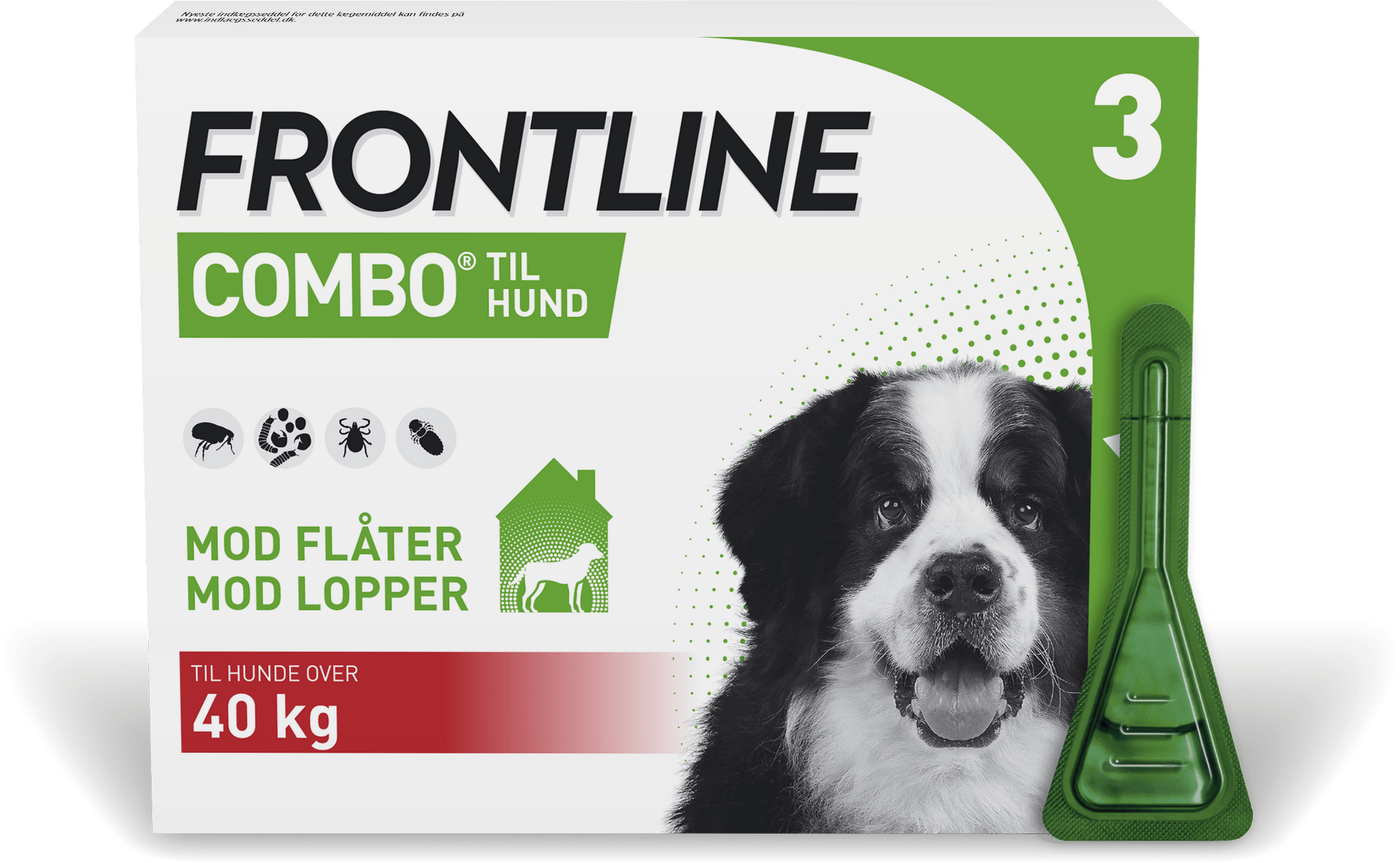 Frontline Combo Vet. er et middel til brug på huden mod lopper og flåter. Opløsningen indeholder en kombination af et aktivt stof med adulticide egenskaber, fipronil, og et aktivt stof med ovicide og larvicide egenskaber (S)-methopren. Indikationer: Behandling mod angreb af lopper, flåter og bidende lus hos hund og kat samt angreb af lopper og flåter hos ilder. Beskytter mod nye angreb af voksne lopper i op til 8 uger hos hund og 4 uger hos kat og ilder. Forebygger loppernes formering ved at hæmme udviklingen af æg (ovicid effekt) samt larver og pupper (larvicid effekt) fra æg lagt af voksne lopper i op til 8 uger hos hund og 6 uger hos kat. Effekten over for flåter varer i op til 4 uger hos hund og ilder og 2 uger hos kat. Kan indgå i behandling af allergisk eksem forårsaget af loppeangreb. Mindste behandlingsinterval er 4 uger. Kan anvendes til drægtige og diegivende dyr. Kontraindikationer: Må ikke anvendes til hunde under 8 uger og/eller 2 kilo, katte under 8 uger og/eller 1 kilo samt ildere yngre end 6 måneder. Bør ikke anvendes til syge eller afkræftede dyr. Må ikke anvendes til kaniner. Præparatet til hund bør ikke anvendes til kat/ilder, da dette kan medføre overdosering. Da der ikke foreligger data herom, anbefales det ikke at anvende præparatet til andre dyr end målarterne. Administrationsmåde: Til udvortes brug. Dosering: Til hund: 1 pipette à 0,67 ml fra 2-10 kg; 1 pipette à 1,34 ml fra 10-20 kg; 1 pipette à 2,68 ml fra 20-40 kg; 1 pipette à 4,02 ml til hunde over 40 kg legemsvægt. Til kat og ilder: 1 pipette à 0,5 ml. OBS. Der er forskel i styrkerne på produktet til hund og til kat/ilder. Man bør ikke overdosere. Bivirkninger: Blandt de meget sjældne bivirkninger, der er iagttaget efter brug, er: Forbigående hudreaktioner på applikationsstedet (hudmisfarvning, lokalt hårtab, kløe, rødmen) samt generel kløe og hårtab. Ligeledes er udtalt savlen, reversible nervøse symptomer (forstærket berøringssans, depression, andre nervøse symptomer) samt opkastning og symptomer fra luftvejene observeret. Hvis dyret kommer til at slikke på applikationsstedet, kan voldsom savlen forekomme. Der kan ses forbigående ændringer af pelsens udseende på applikationsstedet (sammenfiltret/fedtet pels). Forsigtighedsregler: Badning med vand inden for 2 dage samt hyppigere end en gang om ugen efter behandling bør undgås. Ved gentagne shampoobade nedsættes virkningsvarigheden. Der foreligger ingen data vedr. mulighed for toksicitet af præparatet hos killinger yngre end 8 uger, der er i kontakt med behandlede moderdyr. Undgå at dyr slikker på behandlingsstedet, og at dyr slikker hinanden efter behandling. Man bør omgå behandlede dyr med forsigtighed, indtil behandlingsstedet er tørt. Tilhæftning af enkelte flåter kan forekomme. Undgå at få produktet i kontakt med mund og øjne. Vask hænderne efter brug. Præparatet kan forårsage irritation af slimhinder, hud og øjne. Dyr eller mennesker med kendt overfølsomhed over for insekticider eller alkohol bør undgå kontakt med produktet. Se endvidere brugsanvisning på pakningen. Pakninger: Æske med 3 pipetter: 0,5 ml, 0,67 ml, 1,34 ml, 2,68 ml og 4,02 ml. Æske 6 pipetter: 0,5 ml. Udl. V. Januar 2013. Indehaver af markedsføringstilladelsen i Danmark: Merial Norden A/S.